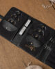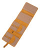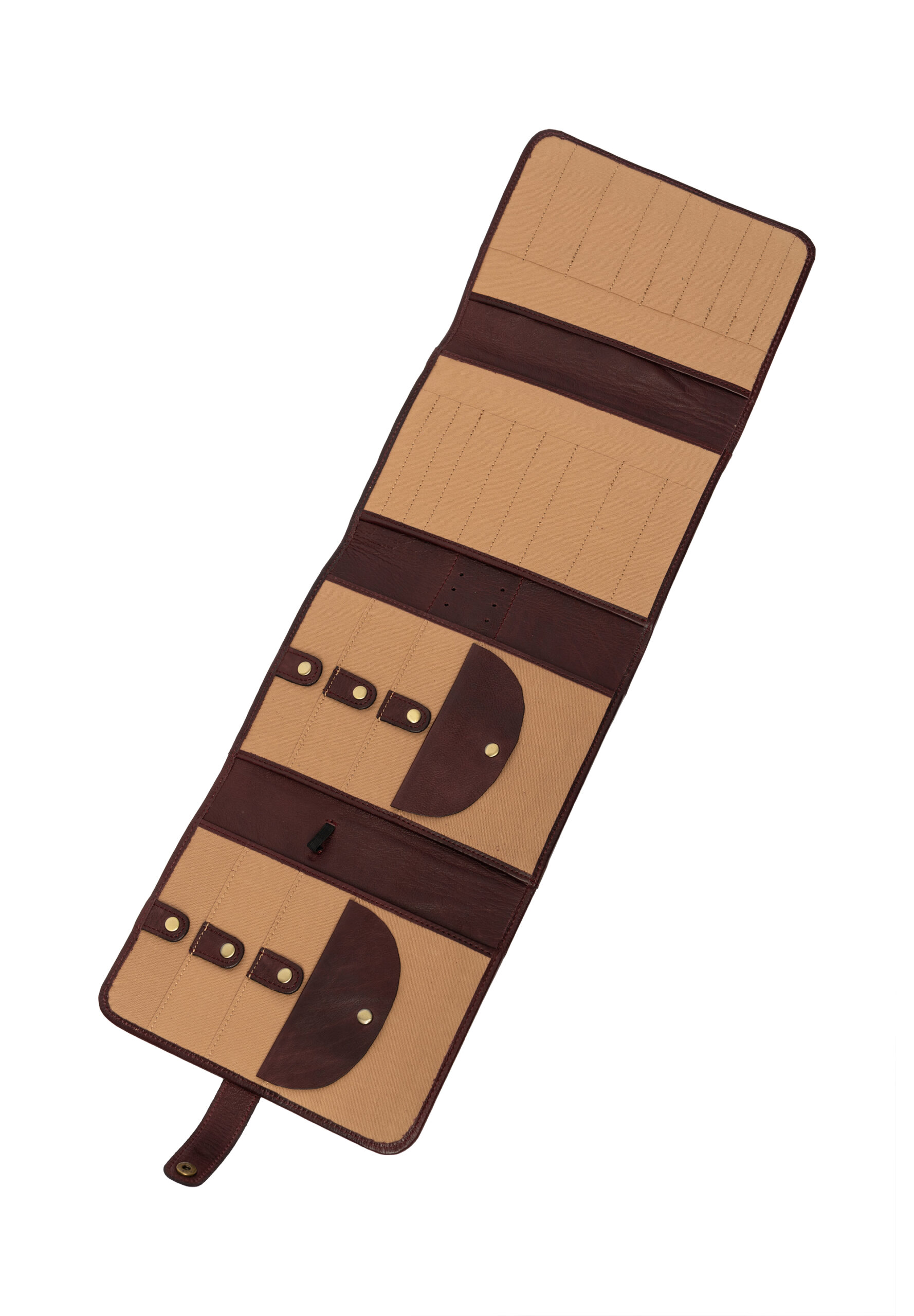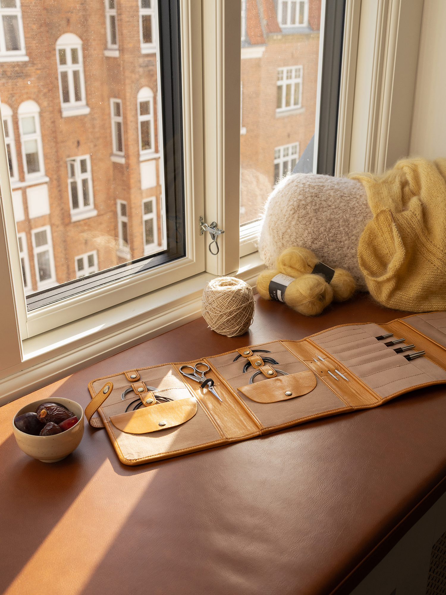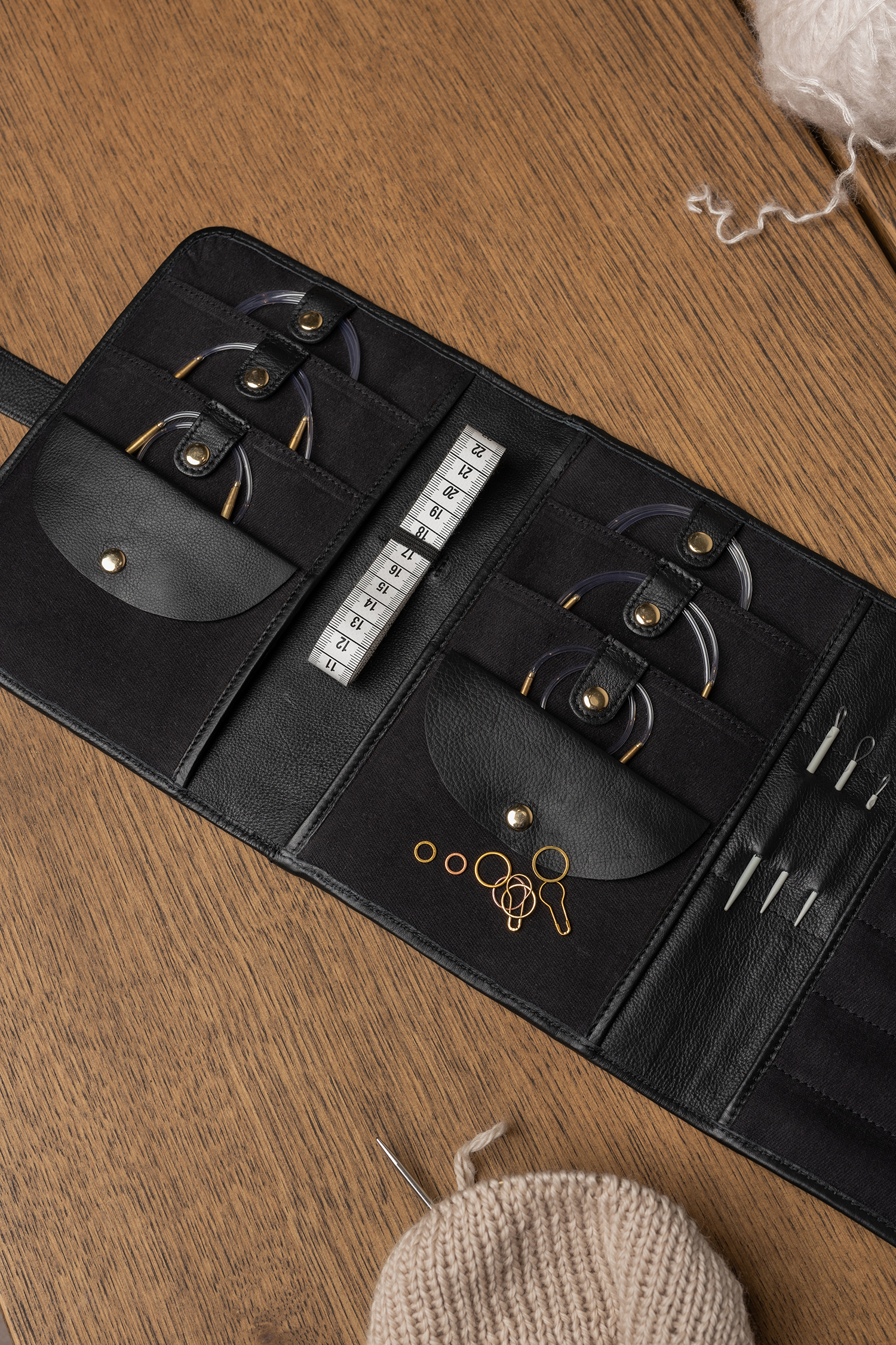 PROJECT 14 is an XL needle case for organizing your interchangeable circular knitting needles. It features 6 pockets with snap closures to securely hold your wires. Behind these pockets, there are open compartments where you can store knitting patterns or similar items. An elastic band allows you to keep your measuring tape handy, and there are 6 holes in the leather to accommodate 3 needles. A total of 18 slim pockets for knitting tips, crochet hooks or double pointed needles, will keep them all organized. Finally, you have 2 small pockets with flap and button closure where you can store your scissors and other loose knitting accessories. The entire needle case elegantly folds together and fastens with a snap, making it easy to carry your essential knitting tools.